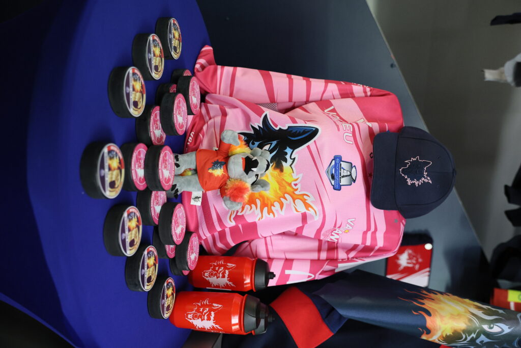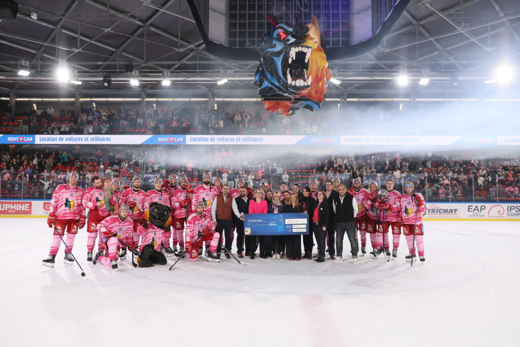 Le 12 octobre dernier, le match de la 9ème journée de Synerglace Ligue Magnus face aux Aigles de Nice était placé sous le thème d’Octobre Rose. Pour l’occasion, plusieurs opérations ont été créées afin de récolter des fonds pour le Fonds de dotation du CHU Grenoble Alpes et le service cancérologie de la femme. Les Brûleurs de Loups portaient un maillot rose, vendu par la suite aux enchères.