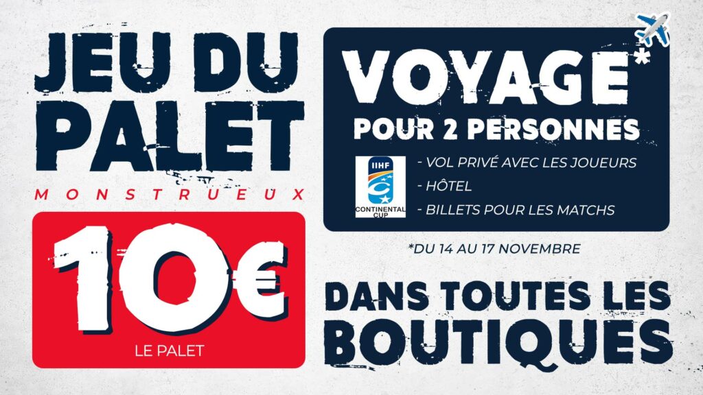 Achetez un ou plusieurs palets dans les différents stands de la patinoire (10€ le palet) et lancez-le(s) sur la glace lors de l’animation du jeu du palet. Le palet le plus proche du centre de la glace remportera ce lot d’exception !