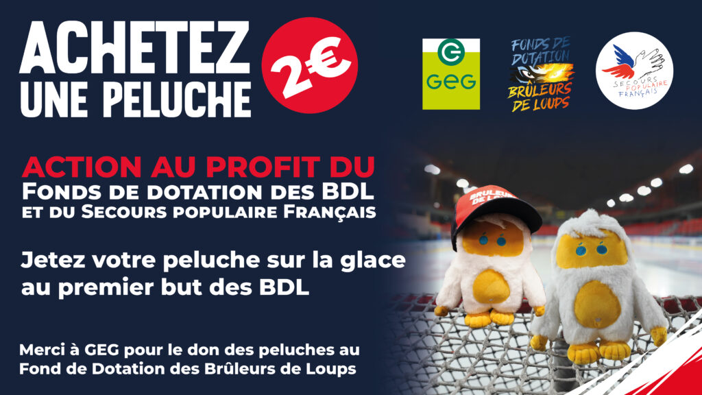 Pour l’occasion, notre partenaire GEG fait un don de 1 500 peluches au club des Brûleurs de Loups ! Ces peluches seront disponibles à la vente à la patinoire Polesud le jour du match, au prix de 2 €. Le montant total récolté sera ensuite reversé au Fonds de dotation des Brûleurs de Loups, afin de financer des projets associatifs.