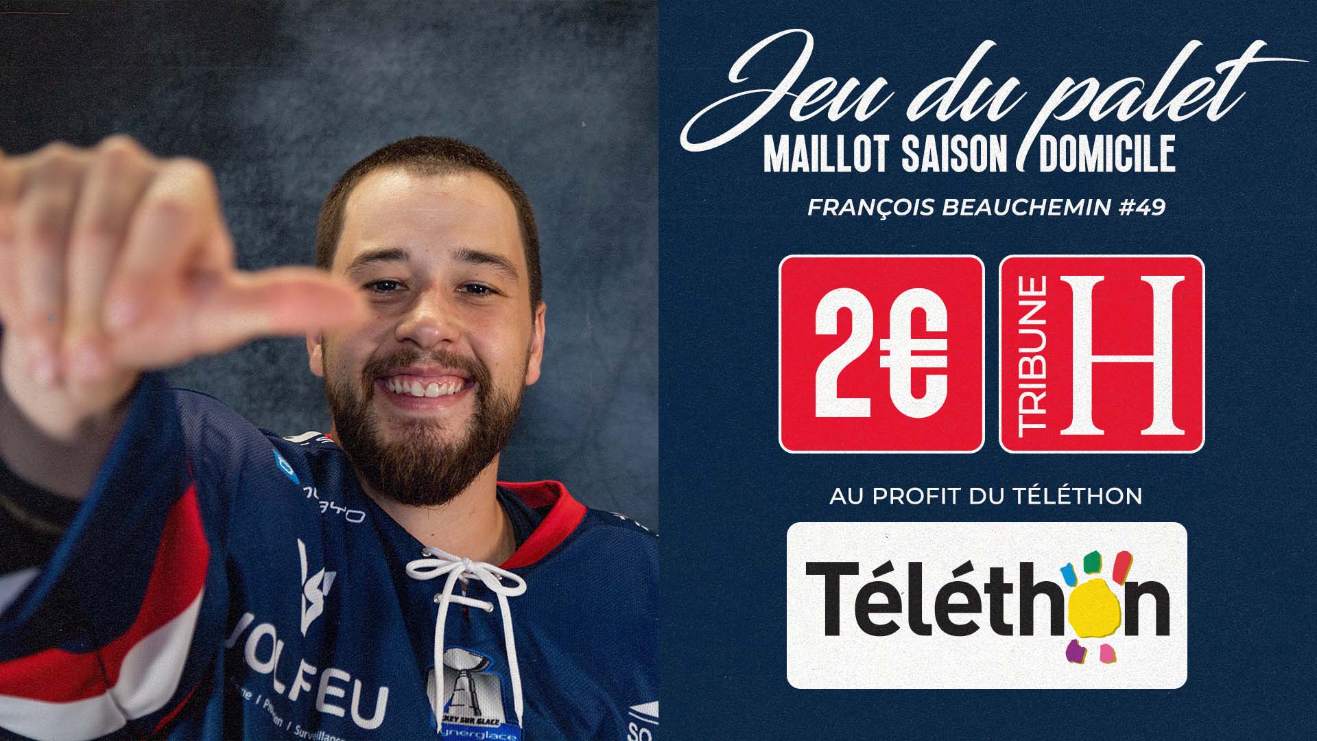 Un jeu du palet sera organisé en faveur du Téléthon. Tentez de remporter un maillot domicile floqué Beauchemin ! Les palets seront en vente en tribune H au prix de 2 €.