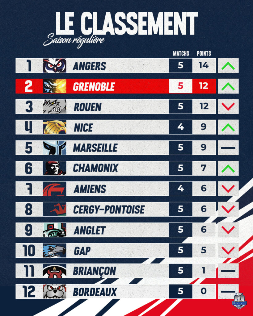 Après une saison 2024-2025 totalement ratée, achevée à la dernière place, les Rapaces de Gap partent sur un nouveau cycle. Les hommes de Luciano Basile peinent pour l’heure à retrouver les sommets. Avec 5 points en 5 matchs, les Gapençais pointent en 10ème position, juste devant les deux seules équipes sans victoire jusqu’ici : Briançon (contre qui Gap a lâché le premier point des Diables Rouges) et Bordeaux (0 point).